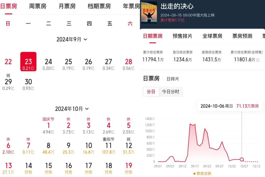 “過度扎堆”表面上疼痛的可能只有片方自身,但大檔期“過度扎堆”的連鎖反應(yīng)是平時(shí)無片可看,對(duì)于影院和整個(gè)產(chǎn)業(yè)而言都是打擊。就在國慶檔開始的前一周,單日大盤已經(jīng)連續(xù)幾天降至2000萬以下的冰點(diǎn),讓文藝片《出走的決心》來獨(dú)挑大梁,當(dāng)了三天的票房冠軍,可見供給之匱乏。
