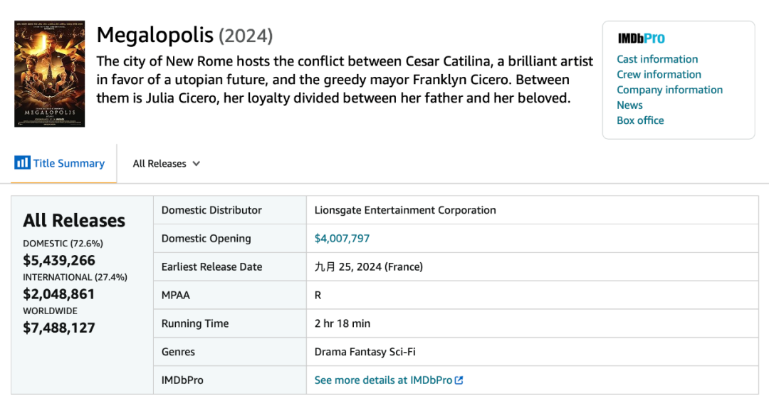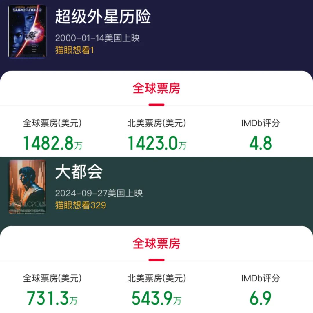 事實(shí)上,《大都會》是科波拉久違在北美大規(guī)模上映的導(dǎo)演作品,上一部還要追溯到2000年聯(lián)合執(zhí)導(dǎo)的《超級外星歷險》,該片曾在2280家影院斬獲673萬美元,最終本土續(xù)航至1422萬美元。
