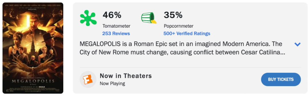 在北美,《大都會》首周末僅拿到401萬美元,創(chuàng)下科波拉導(dǎo)演作品數(shù)十年來的最低值,而媒體和觀眾的口誅筆伐更是雪上加霜;即便《大都會》還有若干海外市場待映,但對比科波拉自掏腰包投入的上億美元資金,院線端的收益并不足以填補(bǔ)巨額虧空,這部野心之作的命運(yùn)恐怕不容樂觀。