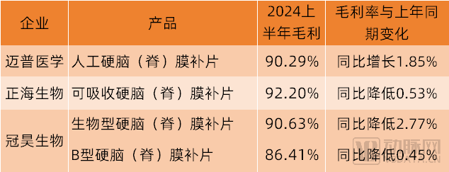 需要注意的是,多次集采加上高國產(chǎn)化率,并沒有讓硬腦(脊)膜補(bǔ)片變成紅海市場。多家上市企業(yè)最新財(cái)報(bào)顯示,硬腦(脊)膜補(bǔ)片目前的毛利率約為90%。