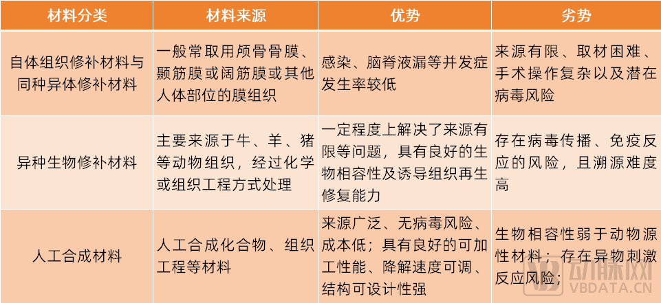 據(jù)了解,硬腦(脊)膜補(bǔ)片是用于修補(bǔ)硬腦膜和(或)硬脊膜缺損的片狀材料類產(chǎn)品。根據(jù)材料劃分,可分為自體組織修補(bǔ)材料、同種異體修補(bǔ)材料、異種生物修補(bǔ)材料、人工合成材料。