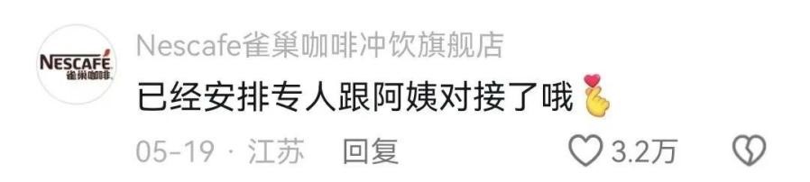 隨著阿嬤的爆火,作為原料的雀巢,也吃上了一碗流量飯,重新被帶回主流視野。阿嬤走紅后,雀巢咖啡在相關(guān)視頻下留言回應(yīng):已經(jīng)安排專(zhuān)人跟阿姨對(duì)接。