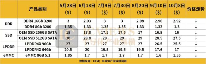 從圖表中可以看出,無(wú)論是 DDR、SSD、LPDDR 還是 eMMC 產(chǎn)品類(lèi)別,其價(jià)格走勢(shì)在觀(guān)察期內(nèi)均呈現(xiàn)下降趨勢(shì)。