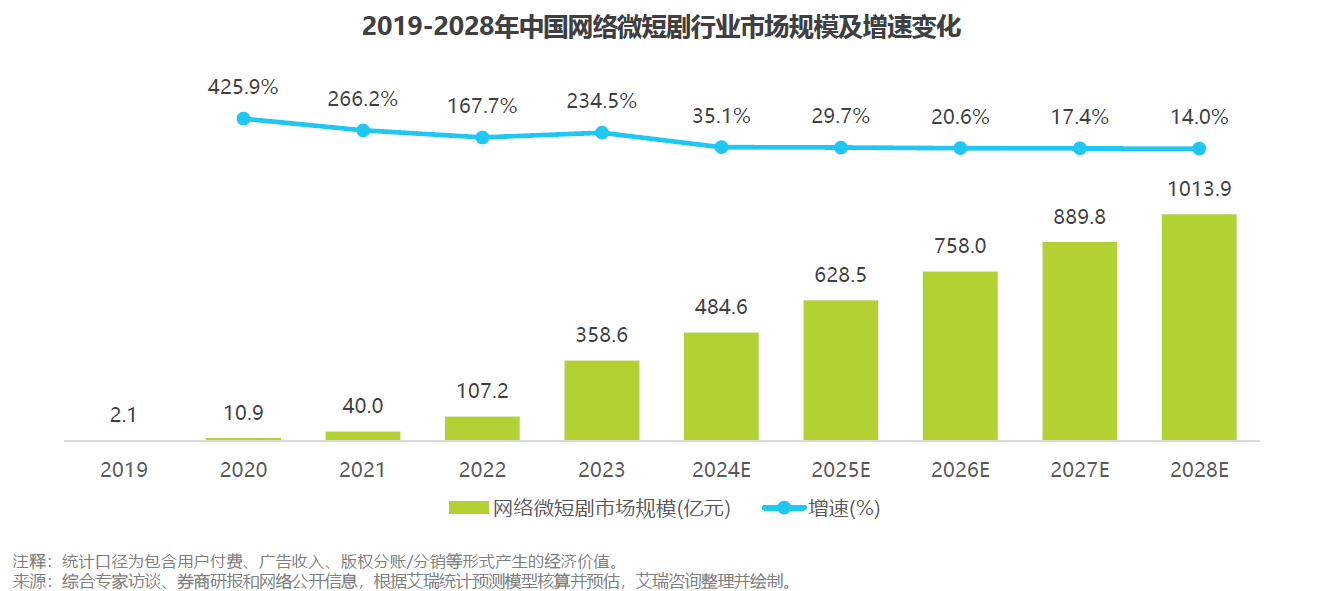 調(diào)研機構(gòu)艾瑞咨詢發(fā)布的《2024年中國微短劇行業(yè)研究報告》顯示,國內(nèi)微短劇市場規(guī)模2023年為358.6億元,較2022年增長了234.5%,2024年將達484.6億元,預(yù)計2028年會突破1000億元。