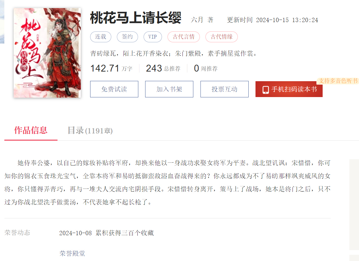 《桃花馬上請長纓》共91集,單集2-3分鐘,在調(diào)研機構(gòu)DataEye統(tǒng)計的2024年9月短劇熱力榜中排名第一。劇集的原著為同名小說,在起點中文網(wǎng)、番茄小說等平臺連載,截至2024年10月15日已更新142.7萬字。