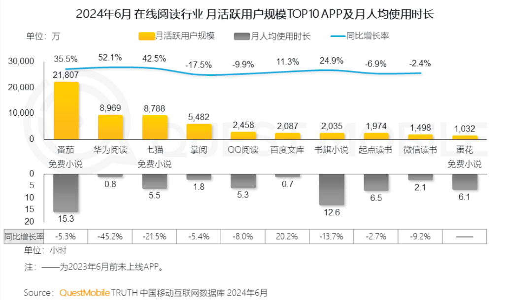 據(jù)QuestMobile數(shù)據(jù),2024年6月,國內(nèi)在線閱讀行業(yè)MAU(月活躍用戶數(shù)),番茄小說排名第一,達2.18億;排名第二、三、四位的華為閱讀、七貓小說、掌閱分別為8969萬、8788萬和5482萬,其余平臺MAU均不高于2500萬;番茄小說的月人均使用時長同樣排名第一,達15.3小時,第二位的是MAU為2035萬的書旗小說,月人均使用時長12.6小時,其余平臺月人均使用時長不超過6.5小時。