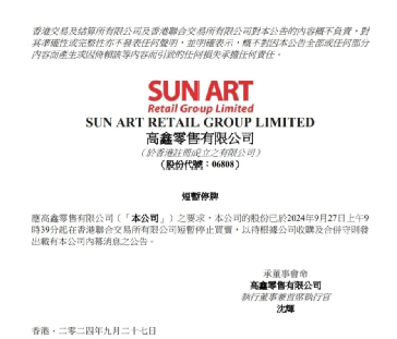9 月 27 日,在京東將部分永輝超市股權(quán)轉(zhuǎn)讓給名創(chuàng)優(yōu)品四天之后,大潤(rùn)發(fā)母公司高鑫零售發(fā)出公告表示,公司股份于 9 月 27 日上午在港交所短暫停止買賣,公司正處理收購及合并相關(guān)事宜。