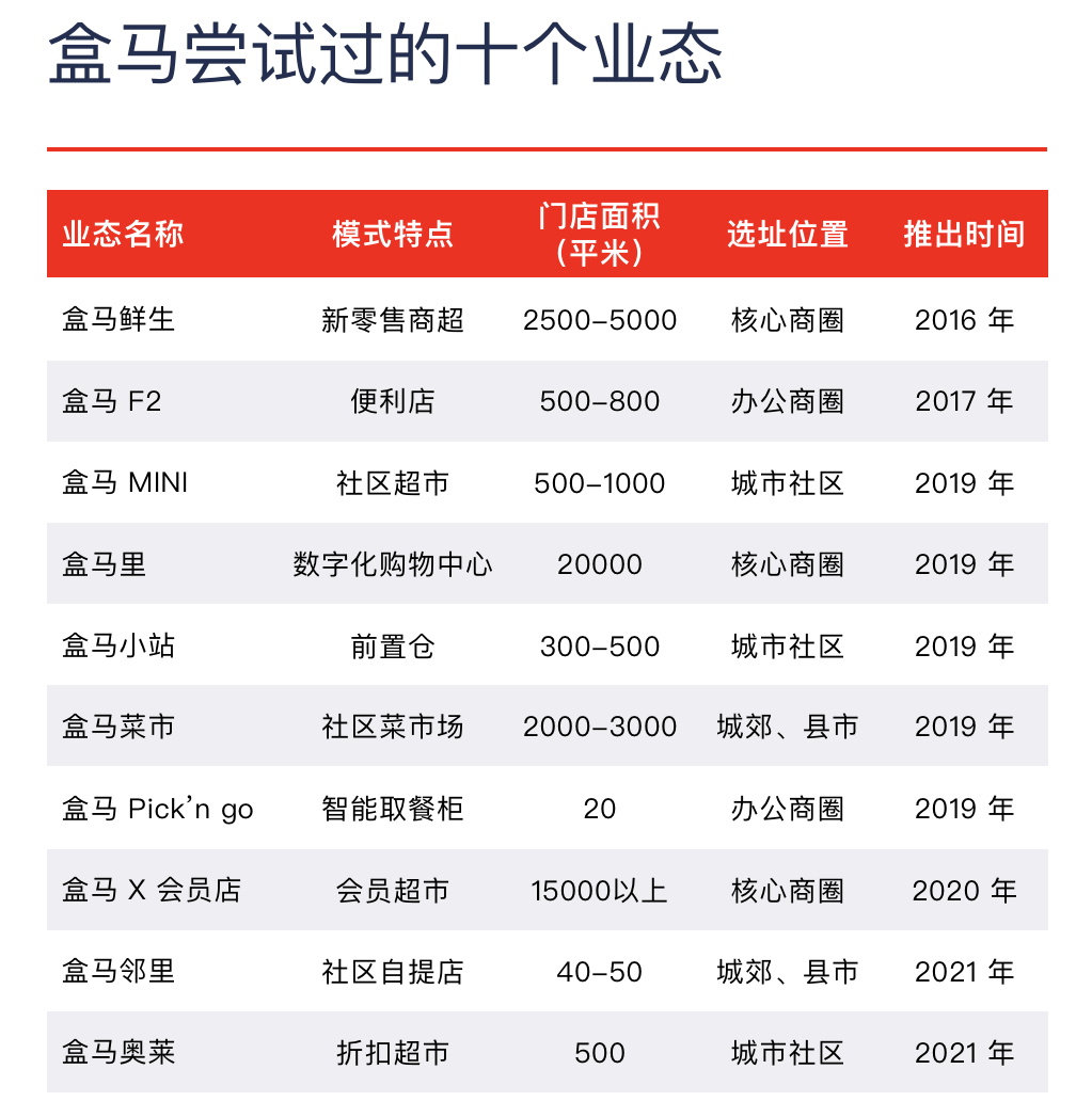 2016 年創(chuàng)立至今,盒馬一共進(jìn)行了多達(dá) 12 種業(yè)態(tài)嘗試。除了盒馬生鮮,還有零售店「盒馬 F2」、社區(qū)超市「盒馬 MINI」、綜合購物中心「盒馬里」、社區(qū)菜場(chǎng)「盒馬菜市」等等。