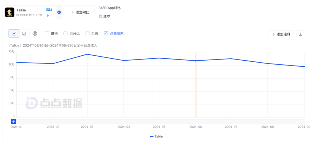 而與QQ智能體類(lèi)似,同樣使用抽卡戰(zhàn)術(shù)的Talkie,數(shù)據(jù)顯示其月收入曾連續(xù)幾個(gè)月超100萬(wàn)美金,但據(jù)點(diǎn)點(diǎn)數(shù)據(jù),Talkie的內(nèi)購(gòu)項(xiàng)目收入對(duì)總收入的貢獻(xiàn)并不突出,今年累計(jì)至今為121萬(wàn)美元,平均每個(gè)月只有12萬(wàn)美元,占月收入的不足10%。