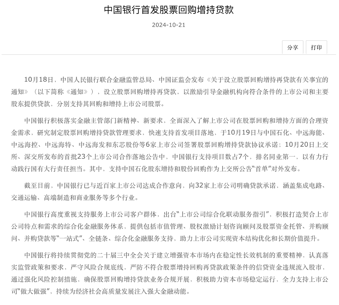 渠道打通后,一大堆公司已在著手申請。中國銀行的最新動態(tài)中稱,“中國銀行于10月19日與中國石化、中遠(yuǎn)海能、中遠(yuǎn)海控、中遠(yuǎn)海特、中遠(yuǎn)海發(fā)和東芯股份等6家上市公司簽署股票回購增持貸款協(xié)議承諾;10月20日上交所、深交所發(fā)布的首批23個上市公司合作落地公告中,中國銀行支持項目數(shù)占7個,排名同業(yè)第一”。截至目前,中國銀行已與近百家上市公司達(dá)成合作意向,向32家上市公司明確貸款承諾,涵蓋集成電路、交通運(yùn)輸、高端制造和商業(yè)服務(wù)等多個行業(yè)。