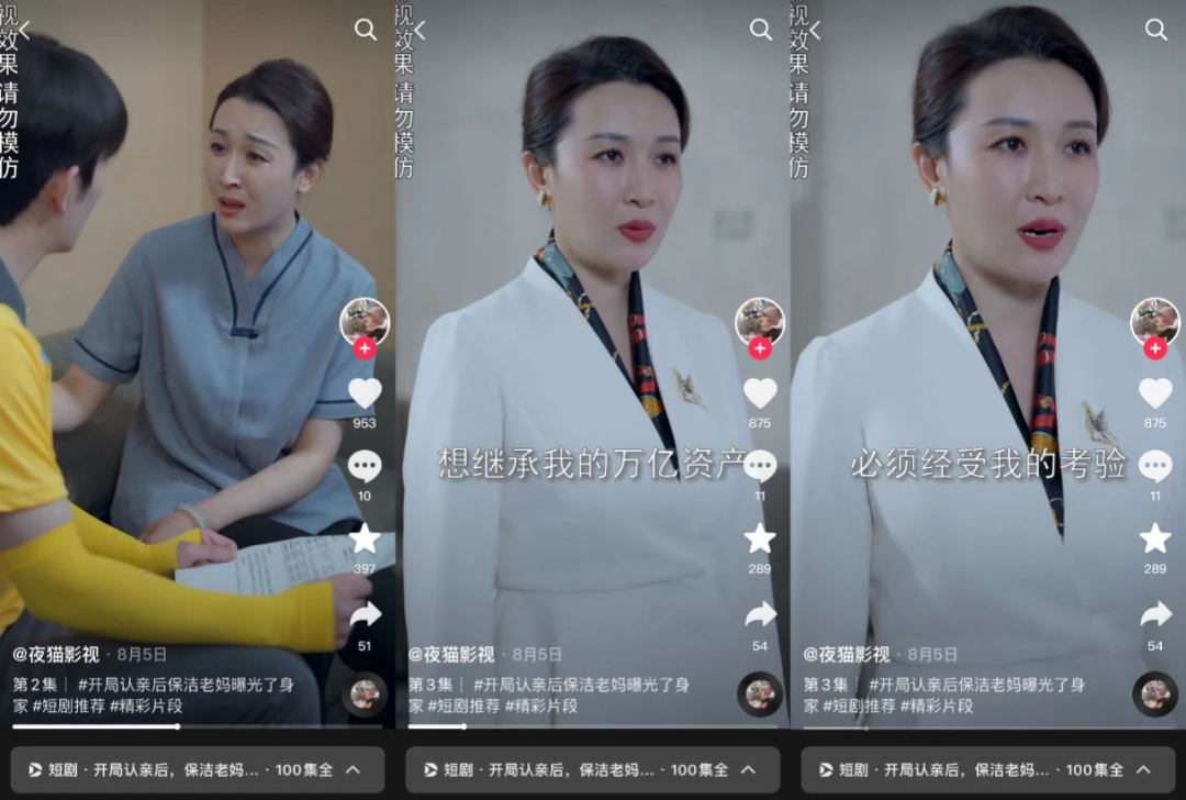 而《保潔老媽》則是引入了更多爽文模板,服務(wù)于更細分人群的不同爽點。如除了該劇外,近期以保潔為主角的短劇還有《一夜幸孕,閃婚老伴寵上天》《五十歲保姆嫁豪門》《保潔老媽是大佬》等。保潔職業(yè)的特殊性以及覆蓋的受眾面,某種程度上讓不同年齡段的用戶產(chǎn)生了代入感。