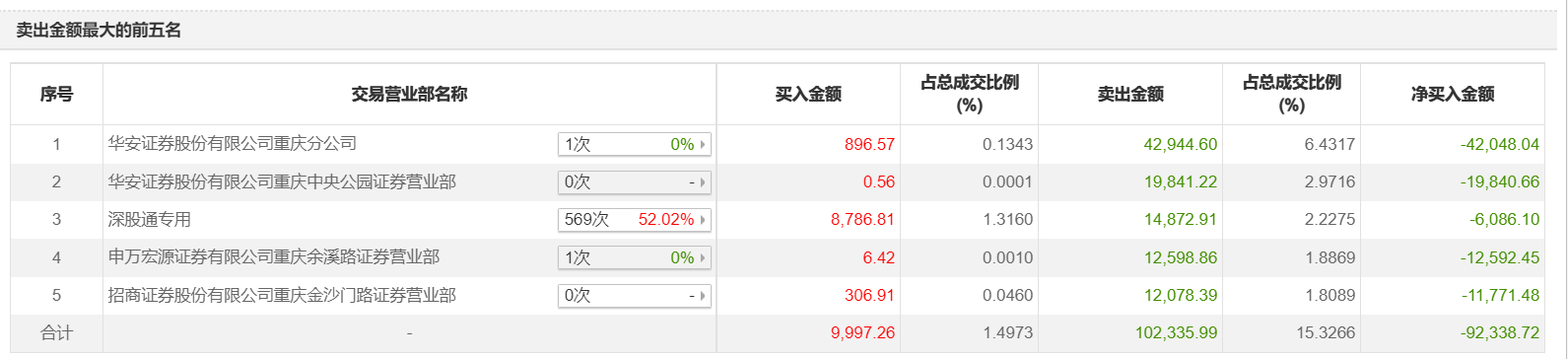 當日,華安證券重慶分公司賣出4.29億元,華安證券股重慶中央公園證券營業(yè)部賣出1.98億元,申萬宏源重慶余溪路證券營業(yè)部賣出1.26億元,招商證券重慶金沙門路證券營業(yè)部賣出1.21億元。四家位于重慶的營業(yè)部僅一日合計賣出約8.74億元。四家營業(yè)部中有2家營業(yè)部均屬于華安證券。