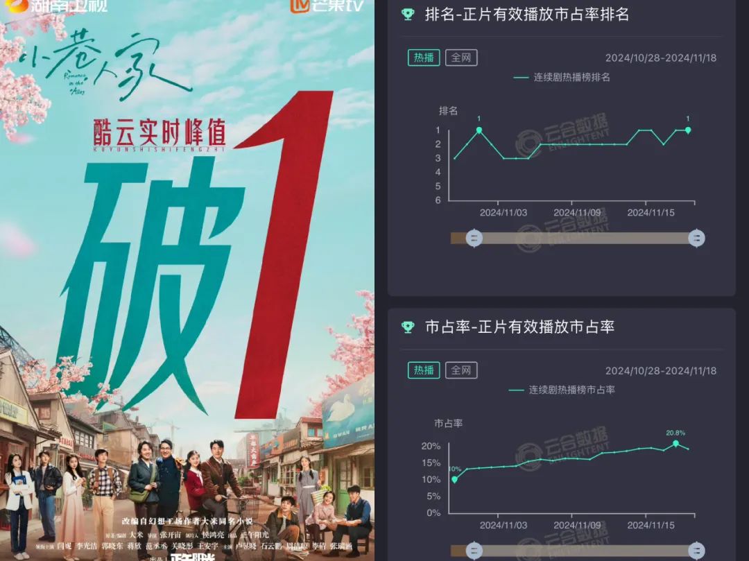 作為一部臺網同播劇,不僅收視破1,成為湖南衛(wèi)視下半年收視冠軍,網播平臺也占據榜首位置,正片有效播放市占率最高達20.8%。