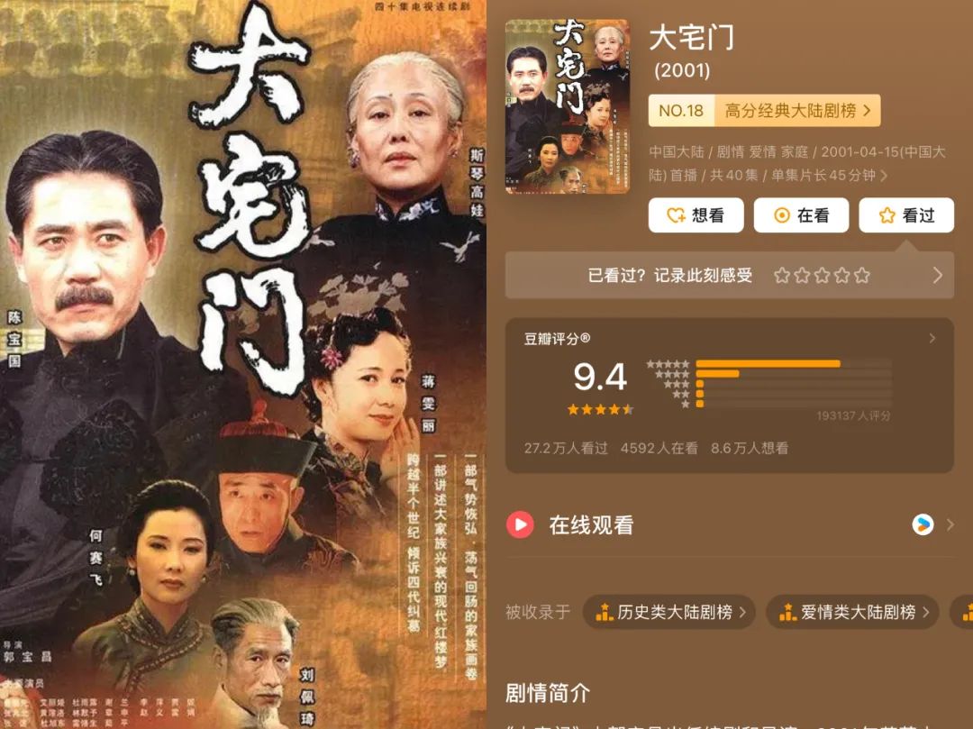 因此,《大宅門》的成功,讓年代劇在千禧年之后迎來了一次創(chuàng)作高潮。《激情燃燒的歲月》《大染坊》《家有九鳳》《金婚》《闖關東》《福貴》《喬家大院》等劇都曾站在了收視的高地。