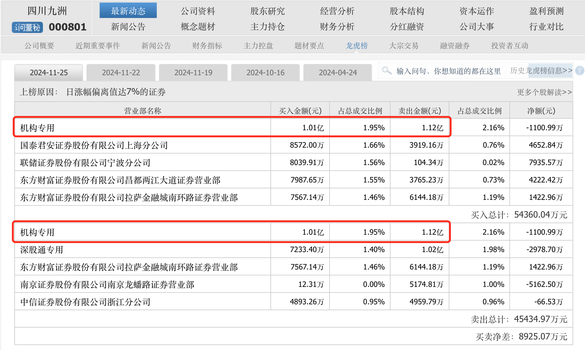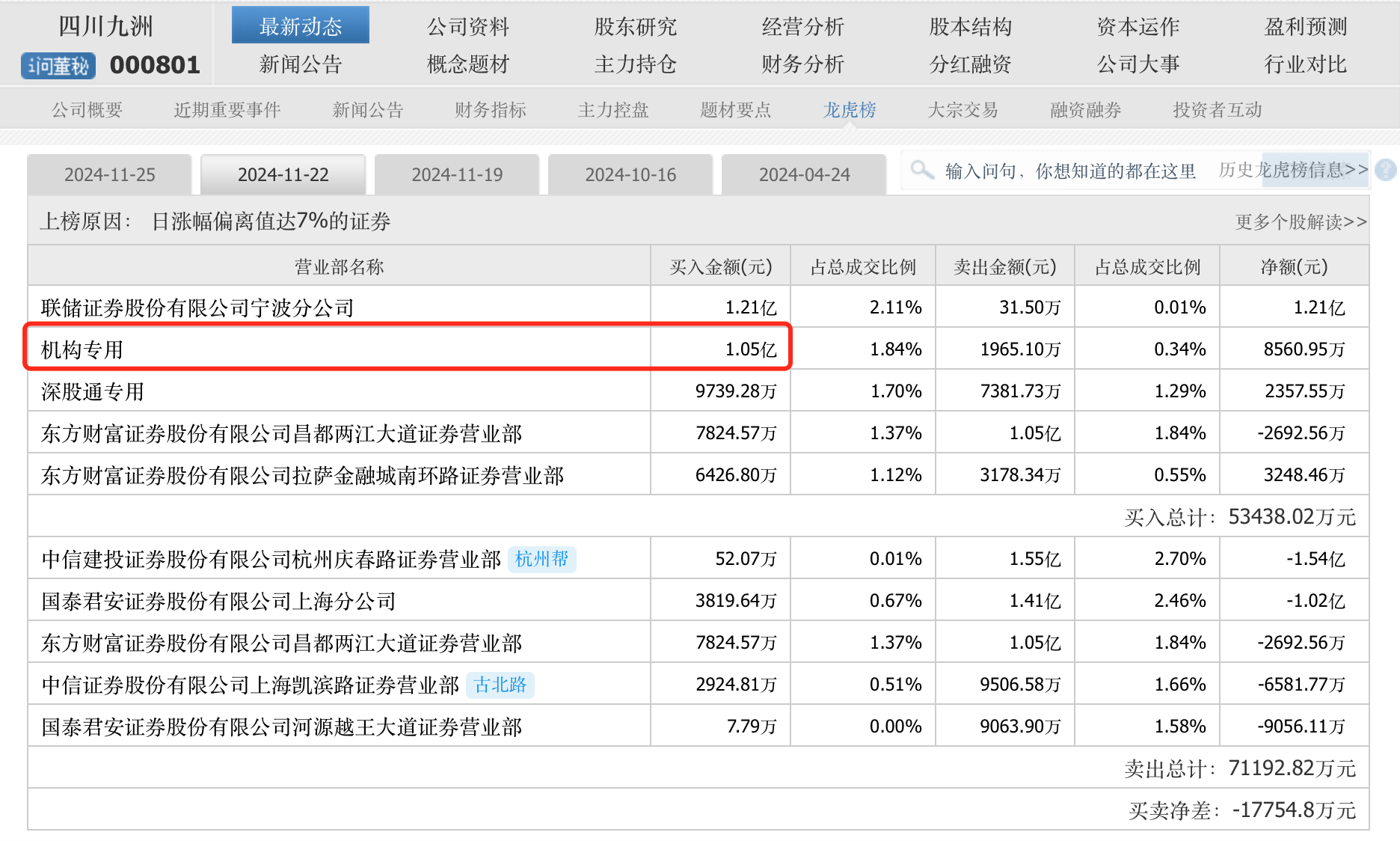 該“機(jī)構(gòu)專(zhuān)用”席位大概率也出現(xiàn)在11月22日的龍虎榜中,11月22日,一“機(jī)構(gòu)專(zhuān)用”席位買(mǎi)入金額1.05億元,賣(mài)出金額只1965.1萬(wàn)元,凈買(mǎi)入額8560.95萬(wàn)元。11月22日四川九洲換手率29.87%,成交額57.3億元。