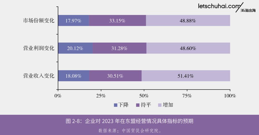 該報告也顯示,約7%的中國企業(yè)表示在東盟的業(yè)務可能虧損;約2成的中國企業(yè)表示在東盟的市場份額、營業(yè)利潤和營業(yè)收入會下降;約2%的中國企業(yè)表示計劃縮減東盟業(yè)務規(guī)模或直接退出市場。