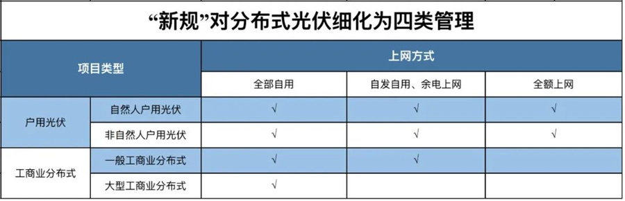 此番分布式光伏新規(guī),根據(jù)分布式當(dāng)前實(shí)際情況,將原有的兩類(戶用光伏和工商業(yè)分布式)細(xì)化成了四類進(jìn)行管理——自然人戶用光伏、非自然人戶用光伏;一般工商業(yè)分布式(6MW以下)、大型工商業(yè)分布式(6MW以上)。
