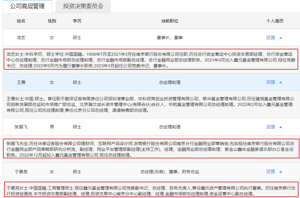 獨(dú)角金融梳理發(fā)現(xiàn),曾在南京銀行擔(dān)任職務(wù),后來兜兜轉(zhuǎn)轉(zhuǎn)進(jìn)入鑫元基金的高管及基金經(jīng)理,不在少數(shù)。董事長龍藝、總經(jīng)理助理張鵬飛、以及前任總經(jīng)理張麗潔、原固定收益部副總經(jīng)理趙惠等,均在南京銀行有過豐富的管理或投研經(jīng)驗(yàn)。