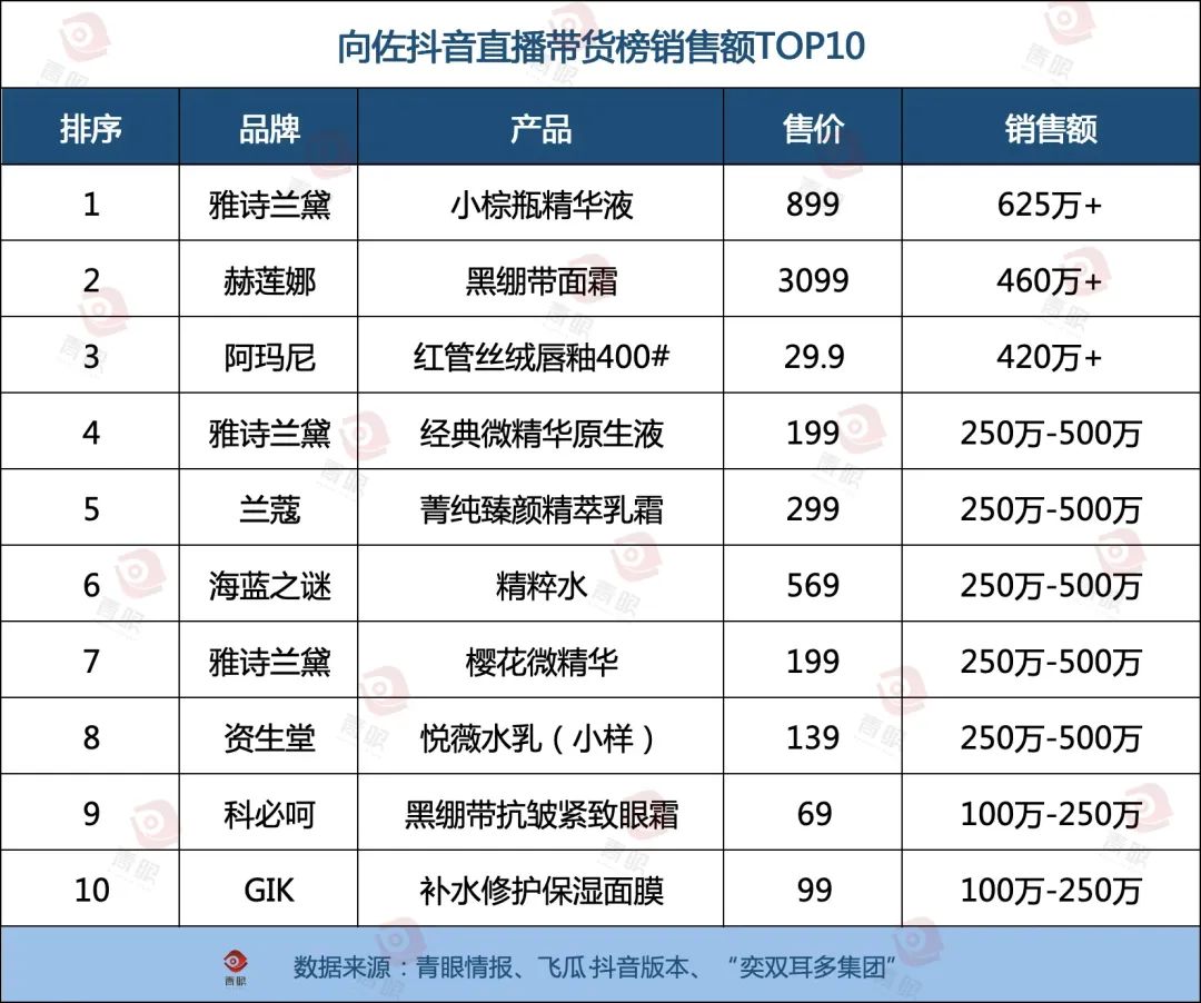 從這一方面來看,向佐的單日帶貨能力與當(dāng)前抖音月榜排名第一的“與輝同行”基本相當(dāng)。此外,向佐帶貨產(chǎn)品基本均為美妝日化產(chǎn)品,在本月3日-4日抖音美妝類達(dá)人直播帶貨榜單中,銷售額也是斷層第一。