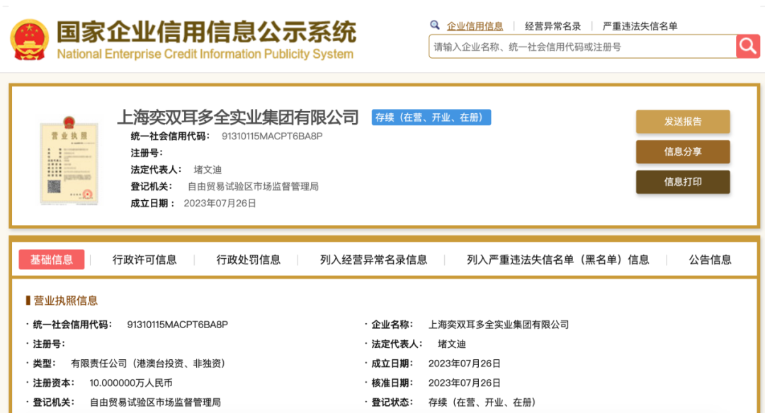 青眼注意到,目前向佐的直播業(yè)務(wù)關(guān)聯(lián)方為上海奕雙耳多全實(shí)業(yè)集團(tuán)有限公司(以下簡稱“奕雙耳多集團(tuán)”)。據(jù)國家企業(yè)信用信息公示系統(tǒng)顯示,該公司創(chuàng)立于2023年7月,由向佐和其他兩位合作人共同成立,注冊資本為10萬元人民幣,其中,向佐持股51%,上海久鼎長宜實(shí)業(yè)集團(tuán)有限公司持股49%。