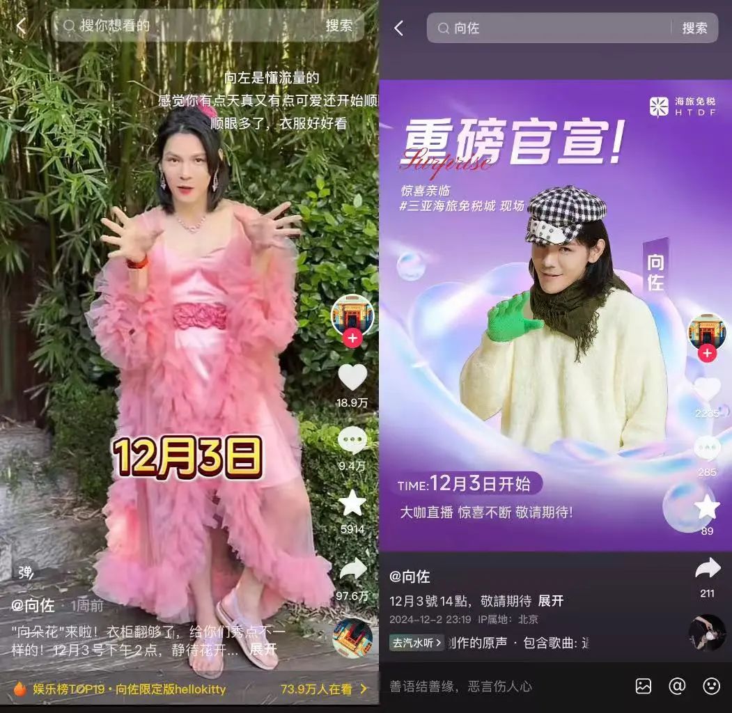 青眼了解到,在該場直播中,向佐與海旅免稅集團(tuán)合作,主要在三亞海旅免稅城現(xiàn)場帶貨大牌美妝日化產(chǎn)品。而早在11月30日,向佐就在其個(gè)人抖音賬號(hào)上身著女裝,發(fā)布了預(yù)告視頻,這一視頻收獲了18.7萬點(diǎn)贊,轉(zhuǎn)發(fā)量達(dá)97萬,是向佐本月上月抖音平臺(tái)點(diǎn)贊熱度最高的作品(除共創(chuàng)視頻外)。