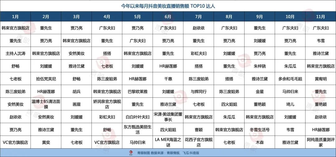 青眼統(tǒng)計(jì)了今年前11月抖音美妝直播銷售額TOP10的達(dá)人變動(dòng)情況,發(fā)現(xiàn)抖音美妝頭部達(dá)人可分為三類,其一是網(wǎng)紅帶貨達(dá)人,其二是明星達(dá)人,其三是品牌自營旗艦店。