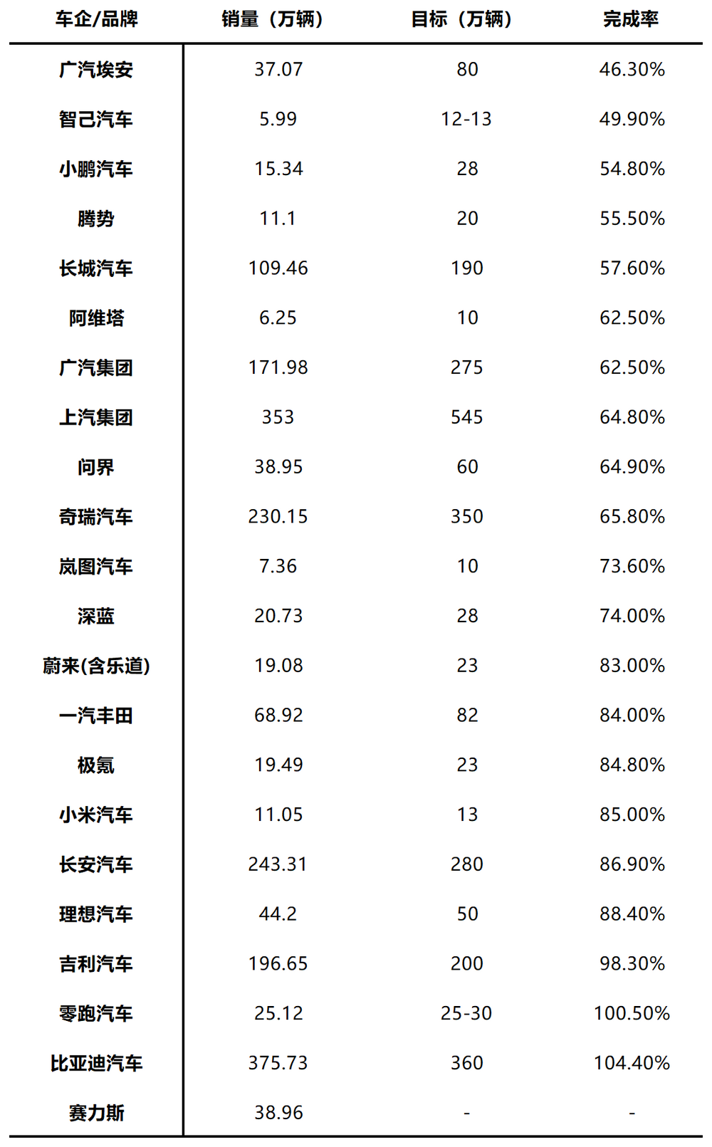 今年前11個月,20余家車企/品牌中比亞迪和零跑率先完成年度銷售目標。完成率超過90%的車企僅有吉利一家車企,近乎完成年度銷量。長安、極氪、一汽豐田、理想、小米等6家車企/品牌完成率均超過80%,但廣汽埃安、智已完成率不足50%。