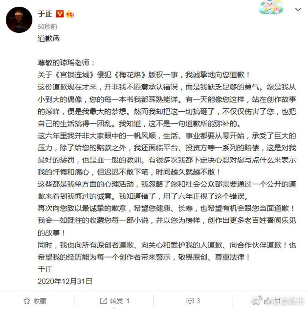 2015年,瓊瑤起訴于正抄襲一案終審宣判,于正被判公開道歉并停止傳播《宮鎖連城》,五被告方共計(jì)賠償原告500萬元。這公開道歉,一直到2020年才在微博執(zhí)行完畢。