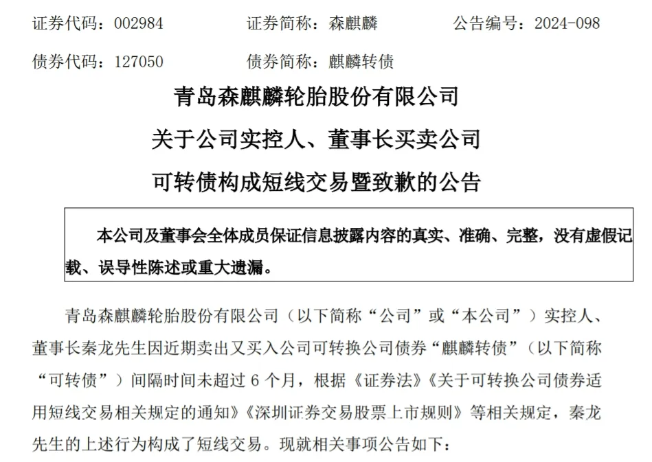 而在一個(gè)月后,森麒麟發(fā)布公告稱,公司實(shí)控人、董事長(zhǎng)秦龍,因涉嫌短線交易收到中國(guó)證券監(jiān)督管理委員會(huì)做出的立案告知書,同時(shí)秦龍還因上述違規(guī)行為,受到深交所的通報(bào)批評(píng)處分。