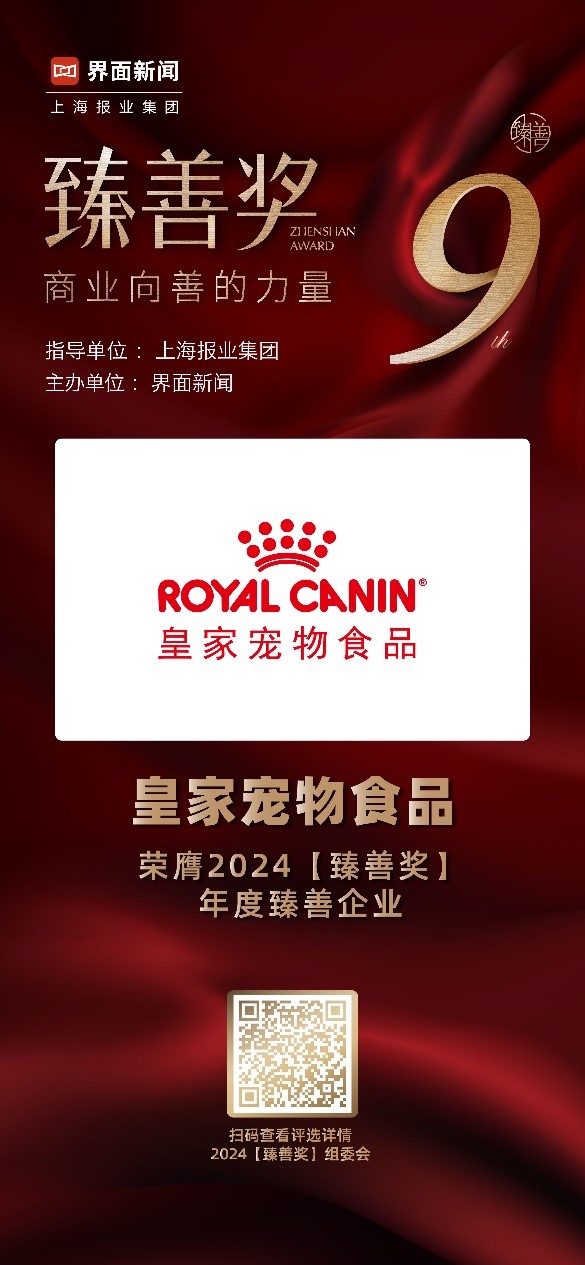 12月18日,上海報(bào)業(yè)集團(tuán) | 界面新聞在上海世博創(chuàng)意秀場舉辦了2024【臻善獎(jiǎng)】頒獎(jiǎng)典禮,并正式公布了本年度獲獎(jiǎng)名單。聚“商業(yè)向善”之力,本屆【臻善獎(jiǎng)】吸引了一大批在公益慈善領(lǐng)域有所貢獻(xiàn)的優(yōu)秀企業(yè)和公益人士參與?;始覍櫸锸称罚ㄒ韵潞喎Q“皇家”)憑借其在寵物健康營養(yǎng)領(lǐng)域的領(lǐng)導(dǎo)地位和對(duì)社會(huì)責(zé)任的深刻承諾,榮膺年度臻善企業(yè)。