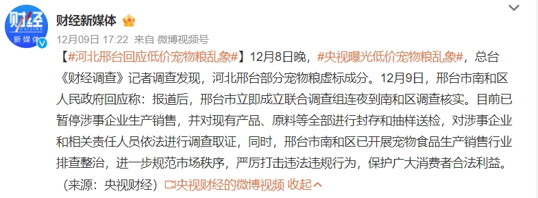 12月8日,據(jù)央視《財(cái)經(jīng)調(diào)查》欄目報(bào)道,在河北省邢臺(tái)市的寵物食品市場(chǎng)存在嚴(yán)重的質(zhì)量問(wèn)題,包括虛標(biāo)成分、篡改產(chǎn)地等行為。河北石家莊、河南開(kāi)封等地的寵物店里充斥著虛標(biāo)成分表、篡改出廠(chǎng)地的低價(jià)寵物糧,有些寵物糧價(jià)格甚至低至100元40斤,即2.5元一斤。