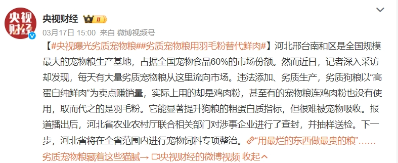 事實(shí)上,這已經(jīng)不是河北寵糧第一次“塌房”了,今年“3·15”期間,央視就曾曝光河北邢臺(tái)有廠(chǎng)家用劣質(zhì)原料生產(chǎn)寵物食品。