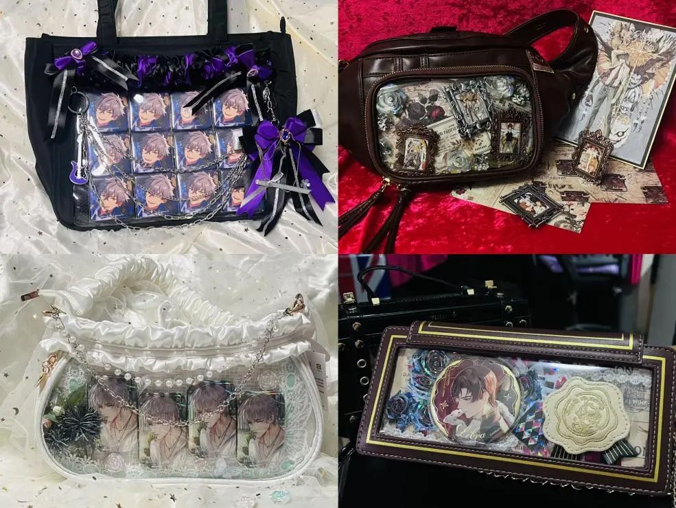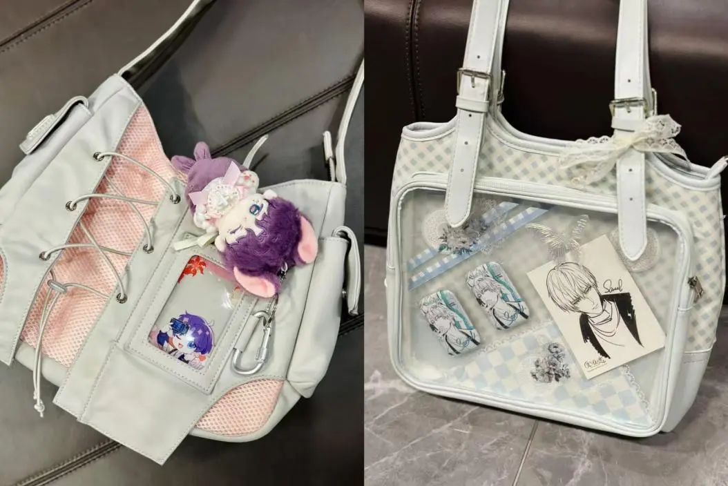 “痛包”指的是掛滿動(dòng)漫人物徽章和玩偶的包包,通過外側(cè)的透明夾層展示谷子。市面上多見的痛包以尼龍材質(zhì)為主,也有一些造價(jià)更高的皮質(zhì)包包,價(jià)格則從幾十元到幾百元不等。