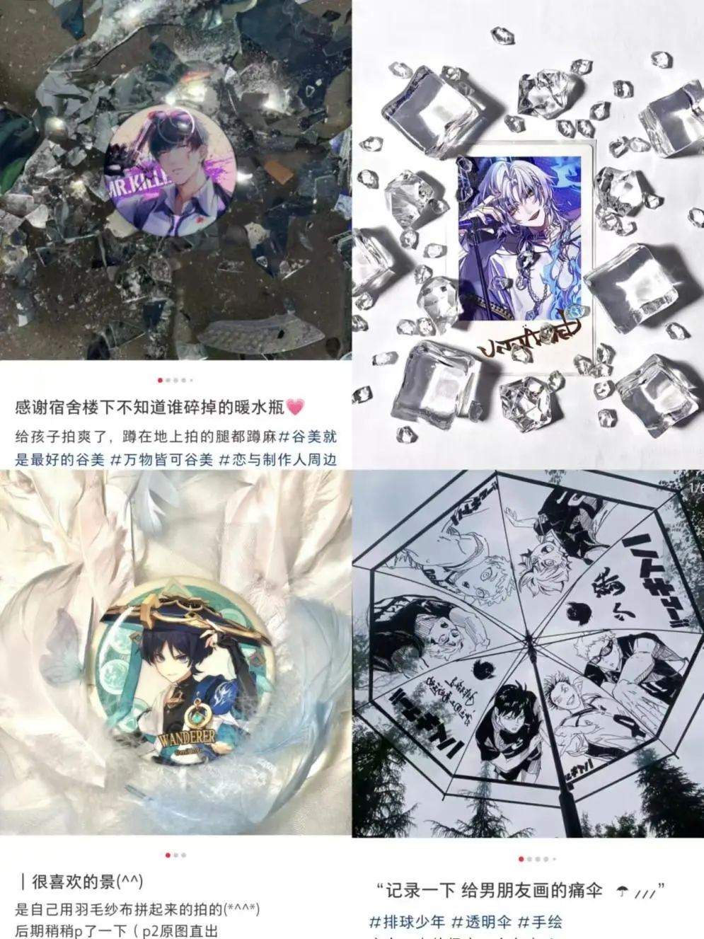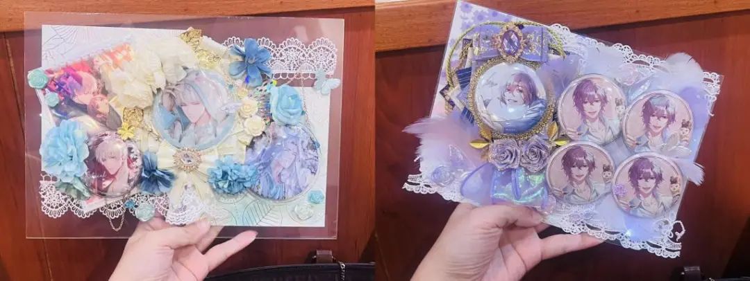 擅長(zhǎng)各類手工制作的暖老師分享了她的“谷美”經(jīng)驗(yàn),全靠審美玄學(xué)。先大致確定一個(gè)風(fēng)格,剩下全靠緣分?!笆诌呌惺裁春线m的就拿來配上看看?!迸蠋熑粘?huì)買一些好看的素材紙作為痛板背景,再用亞力克星星、寶石、蝴蝶、珍珠等配合谷子的小裝飾點(diǎn)綴周邊,蕾絲花邊、蝴蝶結(jié)、緞帶等布藝素材也必不可少。