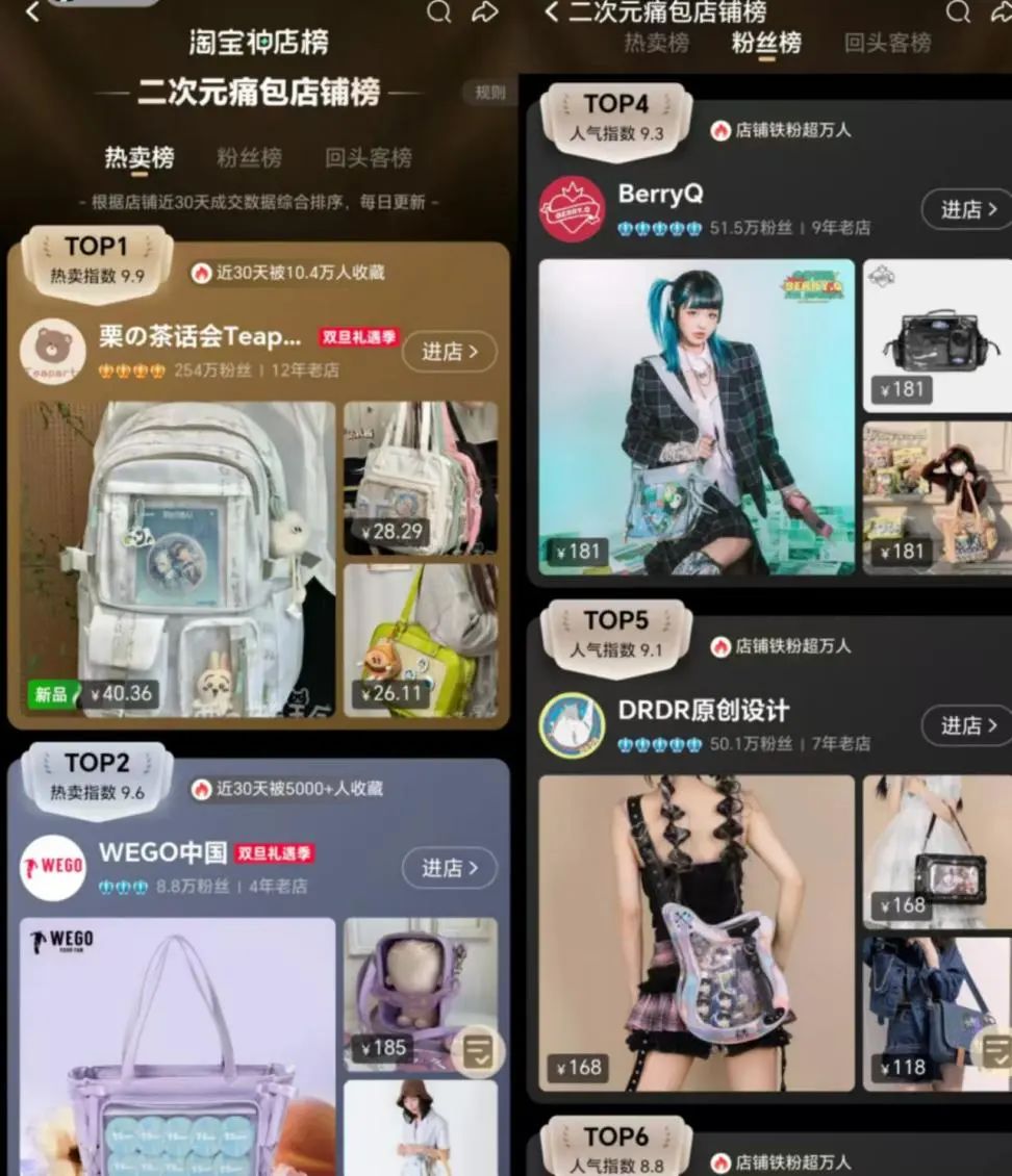 淘寶二次元痛包店鋪榜 圖源:淘寶天貓截圖
