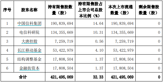 此次解禁股東共六位,包括中國信息通信科技集團有限公司、電信科學技術研究院有限公司、湖北長江中信科移動通信技術產(chǎn)業(yè)投資基金合伙企業(yè)(有限合伙)、大唐電信科技產(chǎn)業(yè)控股有限公司等6位,為公司的前六大股東。