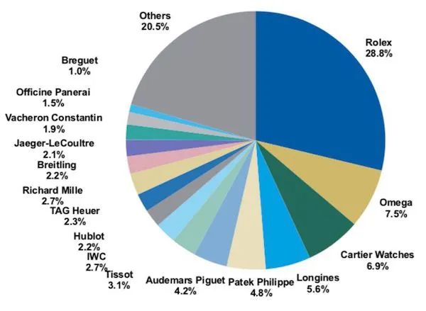 同時(shí),2021年勞力士占據(jù)28.8%的鐘表市場(chǎng),位居第二第三的Omega與卡地亞,兩者市場(chǎng)總額加起來為14.4%,僅占勞力士的一半。