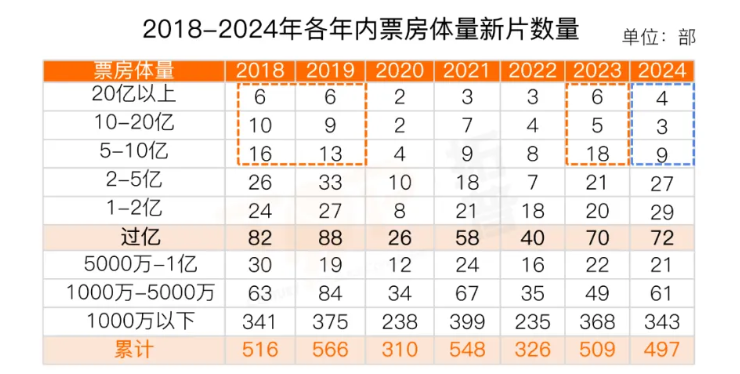 比如,按影片票房梯隊(duì)劃分,會發(fā)現(xiàn)2024年頭部梯隊(duì)還是在,尾部堪稱百花齊放,但腰部更軟了。5億-10億和10億-20億區(qū)間的電影比2023年和疫情前少了太多。這一區(qū)間影片的疲軟是導(dǎo)致票房大盤不佳的罪魁禍?zhǔn)祝脦撞棵黠@沖著這個區(qū)間去的電影滑落到了5億以下區(qū)間,而回看2023年的成功,也依賴像《消失的她》《孤注一擲》等這一區(qū)間的影片沖擊到了更高位置。