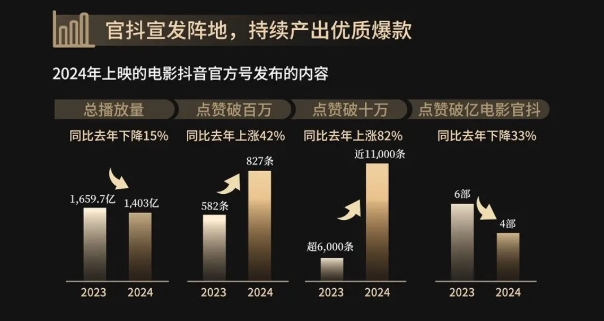 一起一伏之間,彰顯的是如今的商業(yè)電影在傳播場域中的尷尬位置——不引發(fā)全民討論,就會落得無人問津,沒有中間值了。據(jù)《2024年抖音電影年度報告》,來自電影官方抖音賬號的短視頻,總播放量同比上一年下降了15%,但點(diǎn)贊破百萬和破十萬的視頻數(shù)量卻都有同比大幅提升,唯一下滑的是點(diǎn)贊破億的賬號。這與票房梯隊(duì)結(jié)構(gòu)形成了鮮明的互文。