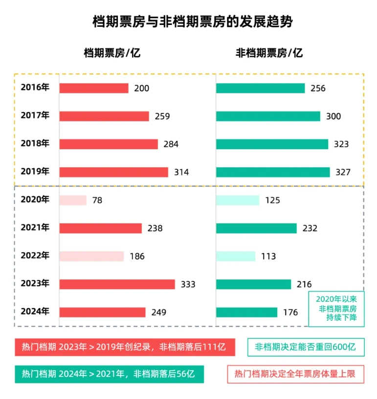 除了按票房梯隊(duì)劃分,按檔期劃分也十分具有觀察價值。2024年單日票房在3000萬以下的天數(shù)達(dá)到了58天,而在2019年是一天也沒有的。疫情前,全年非檔期票房總和常年居于檔期票房總和之上,而最近幾年則形勢完全反轉(zhuǎn)。非檔期觀影,已經(jīng)成為了中國電影市場恢復(fù)的最大難題。