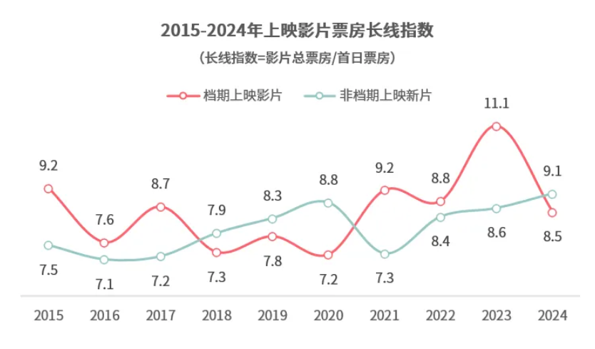 隱性的弊病在于,2024年定檔于檔期中的電影,長尾效應(yīng)太弱,致使大盤一走出檔期就發(fā)生斷崖式下跌。而非檔期電影的定檔策略勢必規(guī)避檔期前后,這就導(dǎo)致檔期附近時段影院尤其冷清。據(jù)貓眼,2024年檔期上映影片長線指數(shù)為8.5,甚至低于2022年,同比上一年產(chǎn)生巨額跌幅。反倒是非檔期上映新片,長線指數(shù)高達(dá)9.1,創(chuàng)歷史新高。