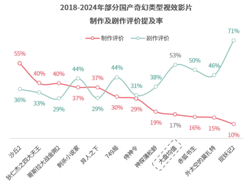 另一方面,類型供給也不應(yīng)該過度單一化。視效大片一直被認(rèn)為是沖擊頭部梯隊(duì)的重要組成部分,這一部分的影片失去吸引力,對大盤打擊是更加嚴(yán)重的。據(jù)貓眼,觀眾對視效影片的評價在過去幾年中從制作層面逐步轉(zhuǎn)移到了劇作層面,而視效大片的制作方,還仍然將更多的注意力集中在視效上,相對忽略了劇作的重要性。這是2024年視效大片失落的最關(guān)鍵原因。