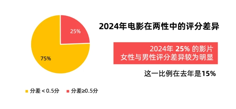 性別分化在今年尤為明顯。據(jù)燈塔,不僅女性觀眾的購票占比上升到了58.4%,而且有25%的影片女性與男性評分差異較為明顯,這一數(shù)據(jù)在2023年是15%。