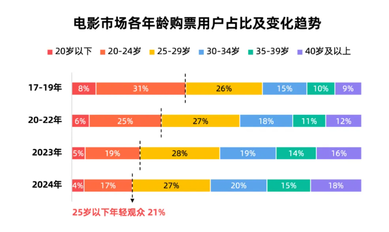 年輕觀眾的流失趨勢同樣愈演愈烈,25歲以下觀眾的占比從2017年-2019年的39%降低到2024年的21%,電影院對新一批觀眾的拉動作用越來越微弱。