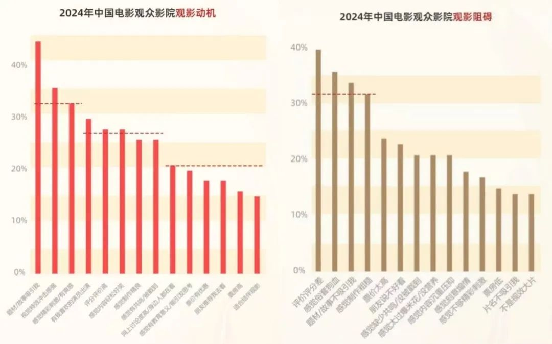 可惜,低票價難以直接成為觀眾進(jìn)影院的動力,只是高票價容易成為進(jìn)影院的阻力。據(jù)11月發(fā)布的《2024中國電影觀眾變化趨勢報告》,觀影動機(jī)中,“票價有優(yōu)惠”僅排在第11位,而觀影阻礙中,“票價太高”卻能排到第5位。