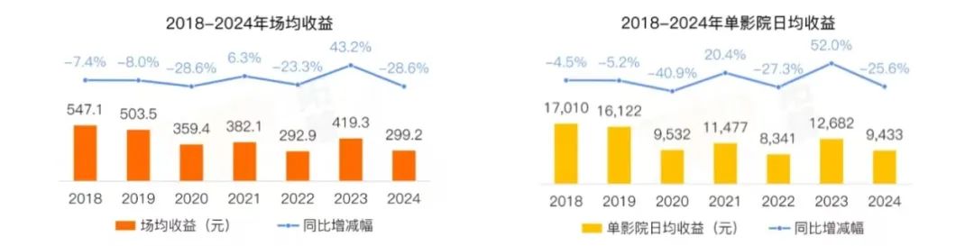 可惜的是,由于票房整體降幅較大,影院經(jīng)營進(jìn)一步承壓。拓普數(shù)據(jù)顯示,2024年影院場均收益299.2元,日均收益9433元,同比去年降幅均高于票房。