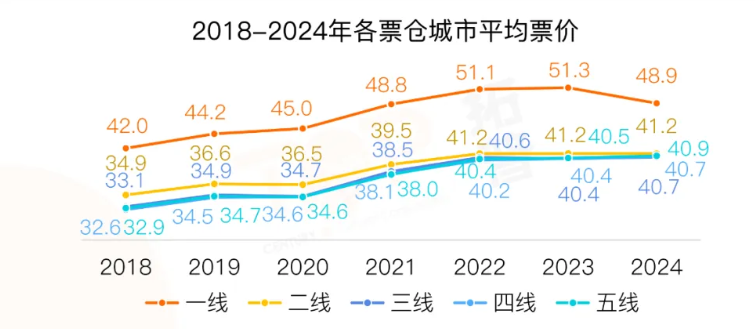下跌主要來自一線城市,據(jù)拓普,一線城市年平均票價48.9元,較上一年下降2.4元;而三線以下的平均票價實(shí)際還有略微上漲,顯示整體票價結(jié)構(gòu)更趨于合理。