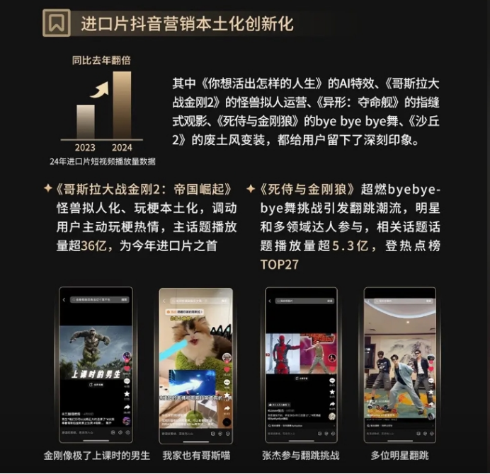 傳播路徑的變化尤其值得注意。毒眸在2023年就曾指出,好萊塢由于法律與文化意識的區(qū)隔,始終難以適應(yīng)國內(nèi)短視頻占主導(dǎo)的宣發(fā)打法,而是堅(jiān)持如戶外廣告、首映禮等傳統(tǒng)電影營銷策略。但2024年,進(jìn)口片更加重視短視頻了,進(jìn)口片短視頻播放量相比2023年翻倍?!陡缢估髴?zhàn)金剛2:帝國崛起》《死侍與金剛狼》等影片均有引發(fā)全站互動的成功案例浮現(xiàn),其思路也是在避免劇透正片的情況下,通過社交玩法來帶動用戶自發(fā)傳播。