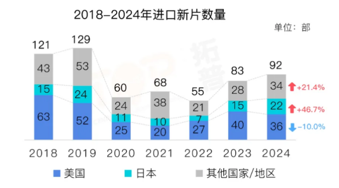 響應(yīng)政策調(diào)整,進(jìn)口片的供給結(jié)構(gòu)更加百花齊放了。2024年進(jìn)口片總數(shù)比前一年增加9部,其中來自日本和其他國家/地區(qū)的影片數(shù)量上漲,而來自美國的影片數(shù)量還減少了4部。許多買斷片如《姥姥的外孫》《周處除三害》等獲得了良好的票房成績,為未來的買斷片市場打開思路。