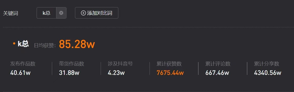 新抖數(shù)據(jù)平臺顯示,近三個月內(nèi),帶著k總相關(guān)標簽的直播切片視頻數(shù)量高達四十萬條,涉及的抖音號也達四萬個以上,正是這些多如牛毛的直播切片視頻,造就了k總的騰飛,讓k總作為一個帶貨博主,卻能靠著切片一個月漲粉千萬,迅速躋身頭部主播行列。